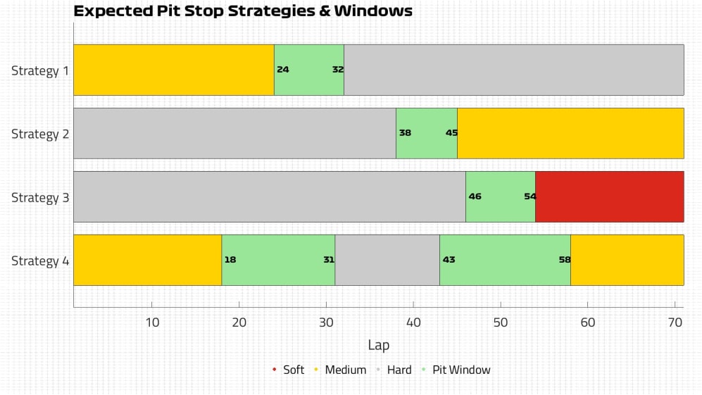 Um stint de abertura entre 24 e 32 voltas permitirá aos motoristas mudar para o composto duro e correr até o final, esperando-se que o duro seja um pneu consistente que também é apenas cerca de 0,3 segundos por volta mais lento do que o médio.